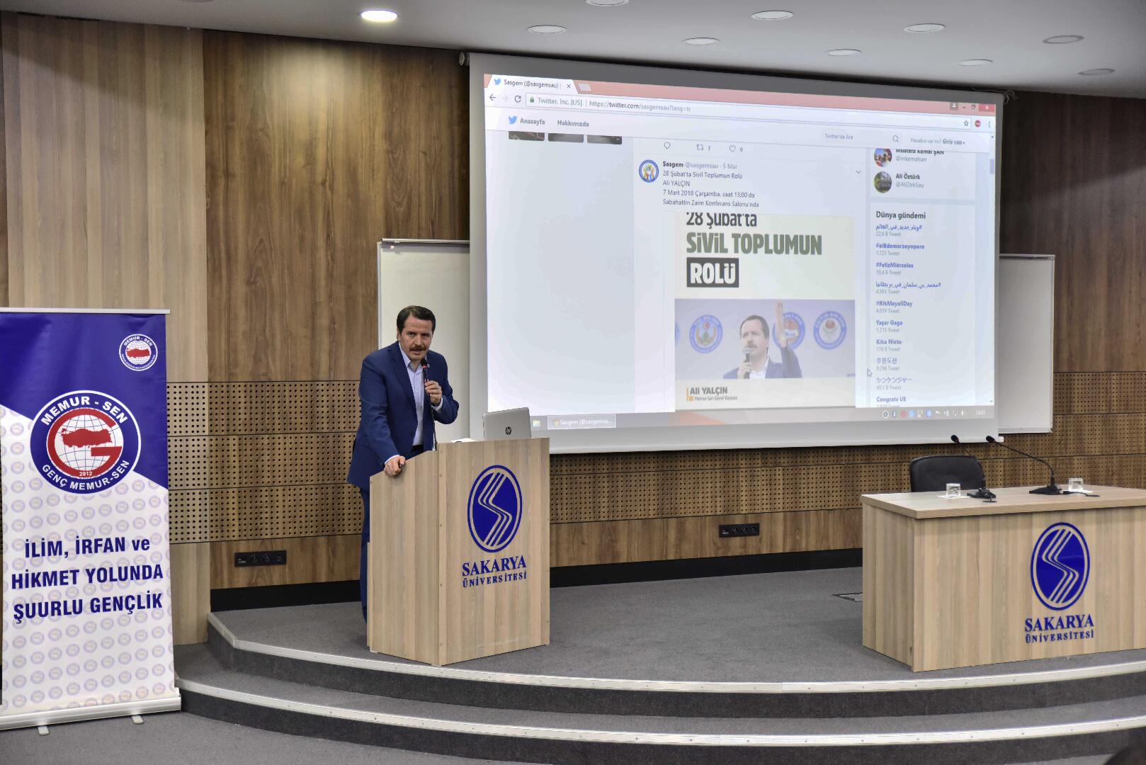 SAÜ Hukuk Fakültesi Sabahattin Zaim Konferans Salonunda gerçekleştirilen konferansa Memur-Sen Genel Başkanı Ali Yalçın konuşmacı olarak katıldı.