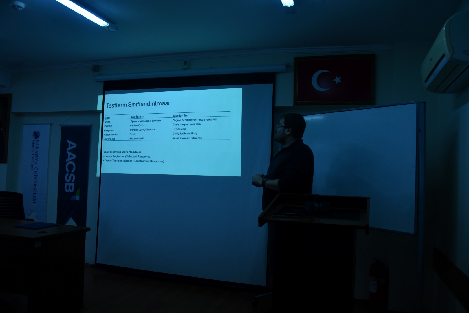 Eğitimde sınıf içi testler ile standart testler arasındaki ayrımlar, test geliştirme sürecinin temel aşamaları, belirtke tablosu hazırlama, kapsam geçerliliği, madde yazım ilkeleri ve puanlama yöntemleri üzerinde duruldu. Dr. Öğr. Üyesi Ertuna, ölçme araçlarında açık ve net ifadelerin önemine dikkat çekerek soruların öğrenciyi yanıltmaya değil, hedeflenen bilgi ve beceriyi ölçmeye yönelik hazırlanması gerektiğini ifade etti.