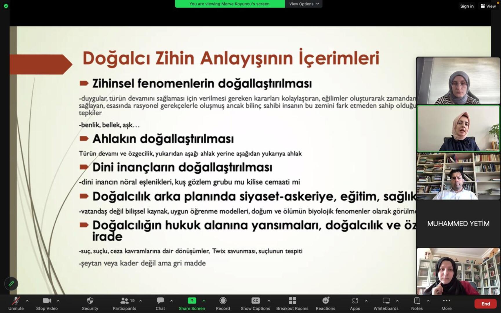 Düzenlenen seminerde Dr. Öğr. Üyesi Merve Koyuncu Albayrak konuk edildi. Albayrak, Çukurova Üniversitesi’nde Prof. Dr. A. Münir Yıldırım ve Prof. Dr. A. Ayhan Çitil danışmanlığında 2022 yılında tamamladığı “Çağdaş Felsefede Geliştirilen Doğalcı Zihin Kuramlarının Etik ve Teolojik İçerimleri” başlıklı doktora tezinin konu seçimi hakkında bilgi verdikten sonra, çağdaş felsefede zihnin mahiyeti üzerinde yürütülen teorileri açıkladı. Bu bağlamda doğalcılık ve teizm ilişkisini ele aldıktan sonra Chomksyci anlamda doğalcılık teorisi geliştirerek doğalcılıktan kaynaklanan bazı sorunların aşılmasını hedeflediğini ifade etti. Sonrasında tezinin sonuçlarını katılımcılarla paylaştı ve katılımcılardan gelen bazı soruları yanıtladı.