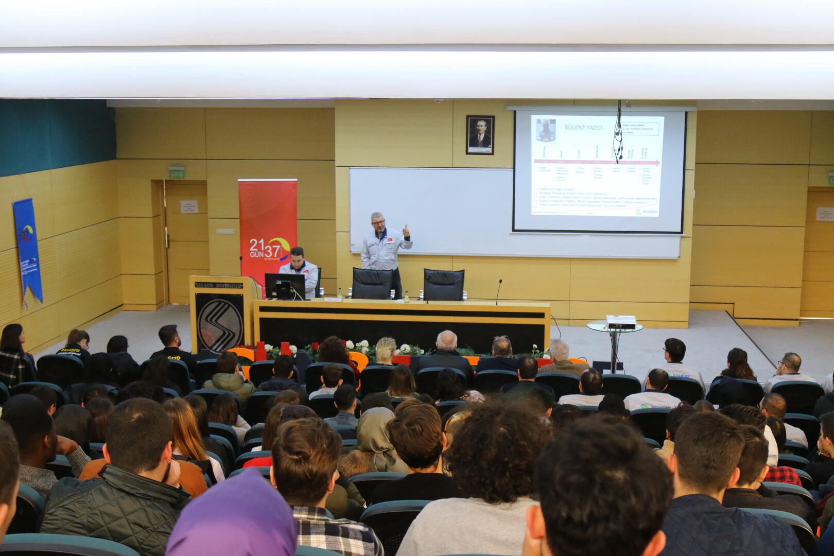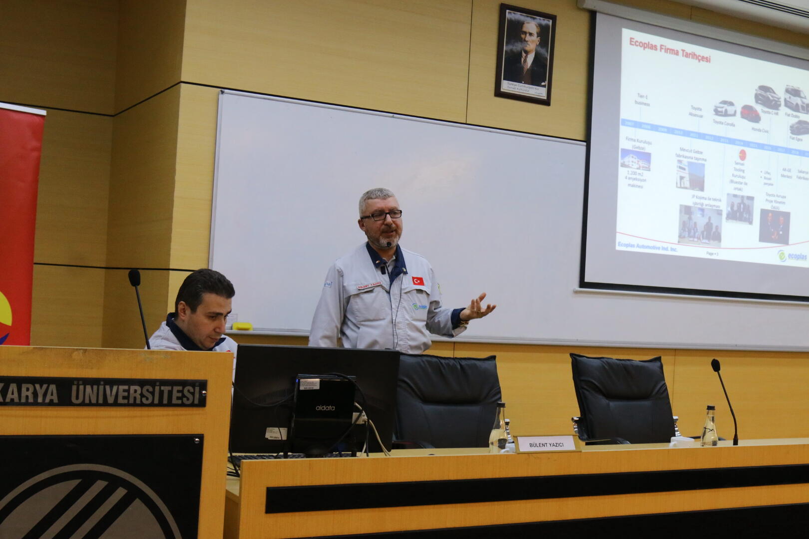 SAÜ Kültür ve Kongre Merkezinde yapılan konferansa ECOPLAS Genel Müdürü Bülent Yazıcı konuşmacı olarak katıldı. Mezun olup sektöre atılacak öğrencilere de bazı tavsiyelerde bulunan Yazıcı, kendi iş hayatında yaşadığı deneyimleri öğrencilere aktardı.
