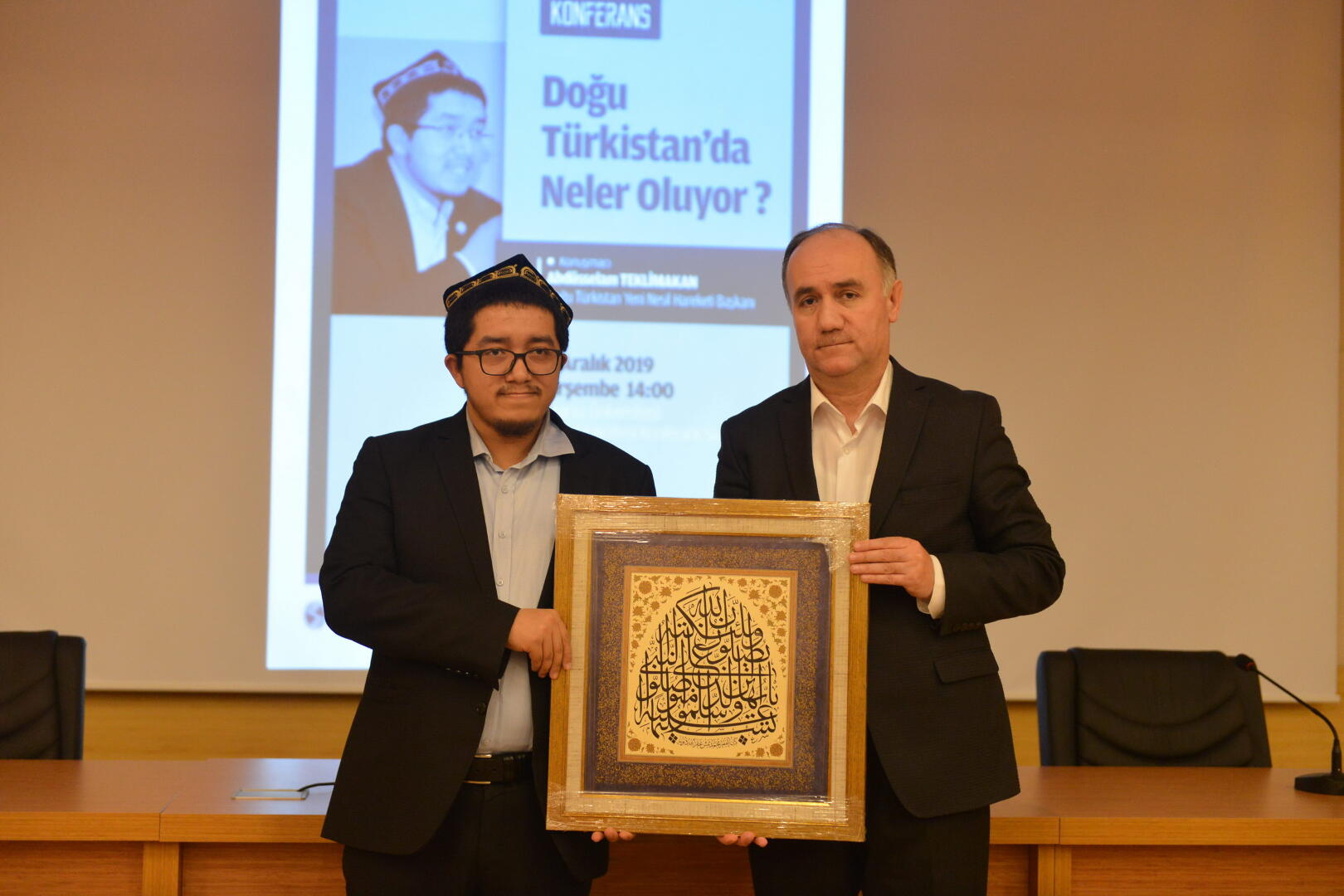 Konferansın ardından SAÜ İlahiyat Fakültesi Dekanı Prof. Dr. Ahmet Bostancı, Abdüsselam Teklimakan’a hediye takdim etti.