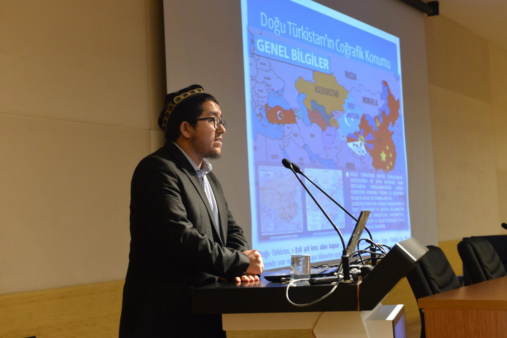 Konuşmasının başında Doğu Türkistan’ın coğrafi konumu, kültürü, mimarisi ve tarihi hakkında önemli bilgiler veren Abdüsselam Teklimakan, Doğu Türkistan’ı “Türkiye’nin 2 katı büyüklüğünde bir yüz ölçüme sahip en doğudaki Türk yurdu” şeklinde niteledi. Teklimakan, sözlerine şöyle devam etti: