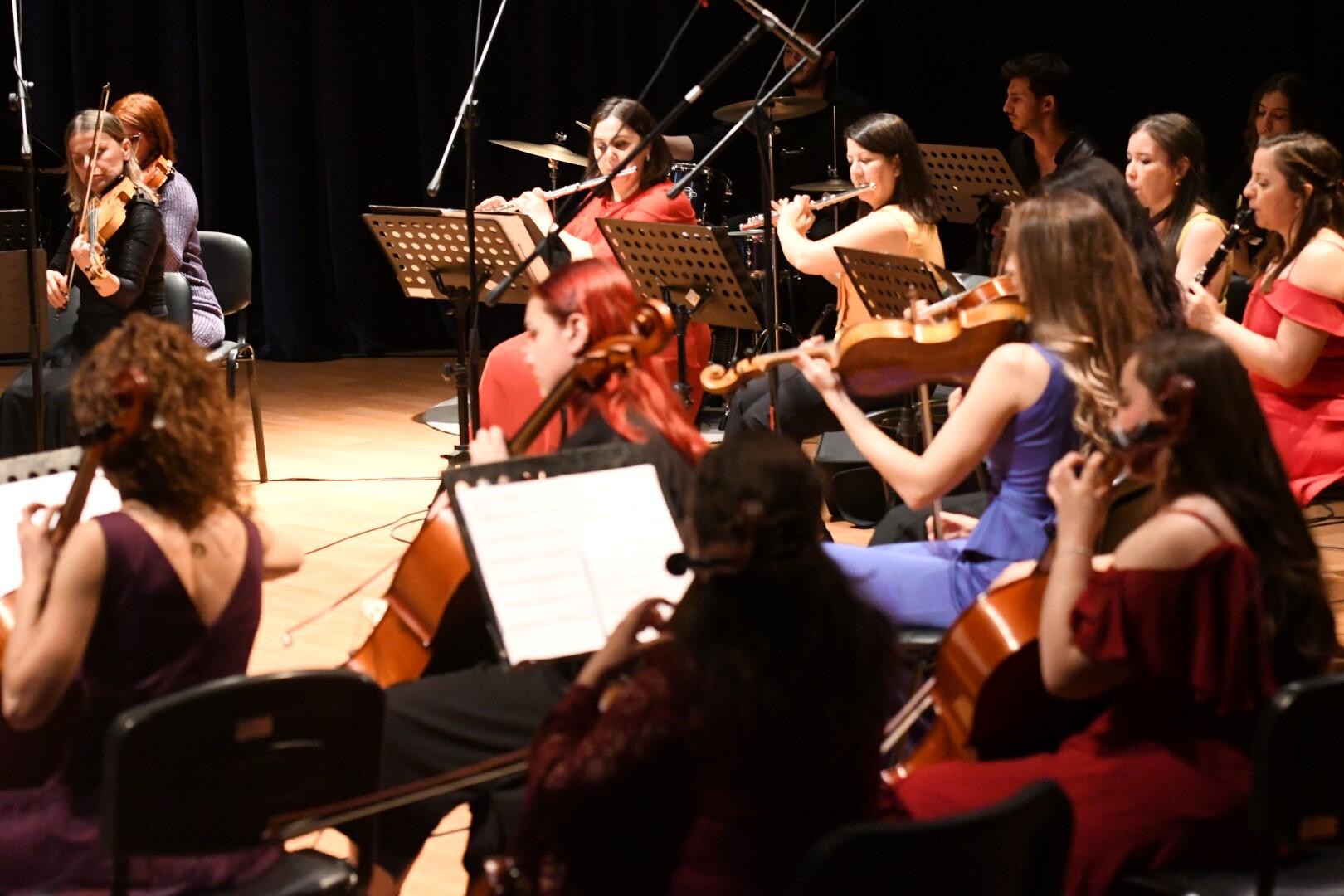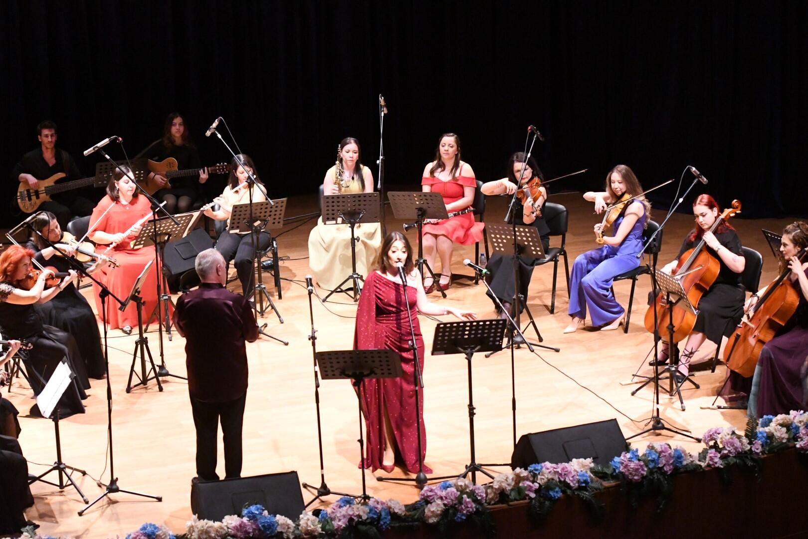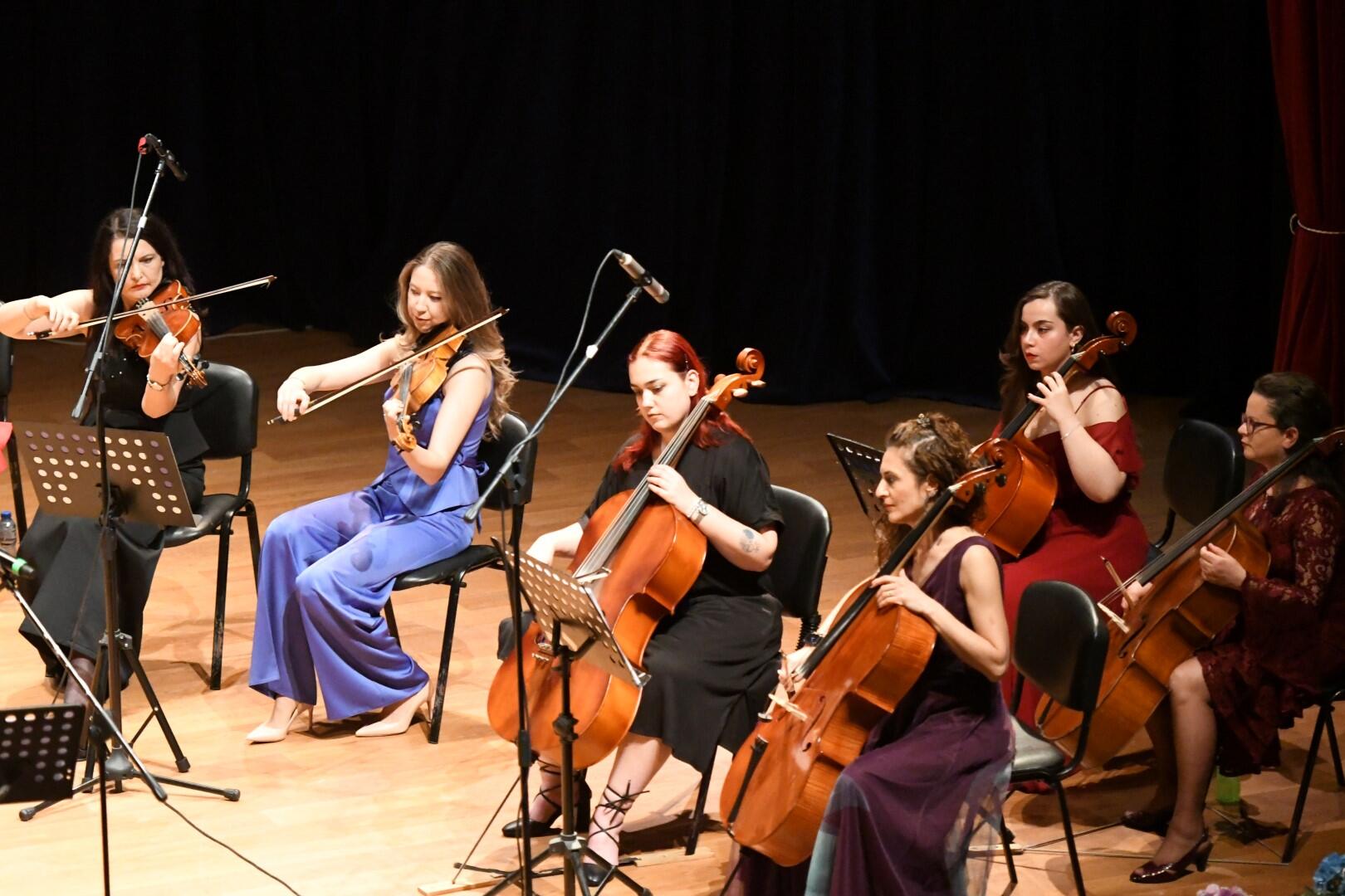 Prof. Dr. Nilgün Sazak, Öğr. Gör. Gül Yıkılmaz ve Buse Ustaoğlu’nun solist olarak yer aldığı konserde keman, viyola, viyolonsel, piyano, flüt, saksafon ve klarnet gibi enstrümanların incelikle işlenmiş melodileri dinleyicileri büyüledi.