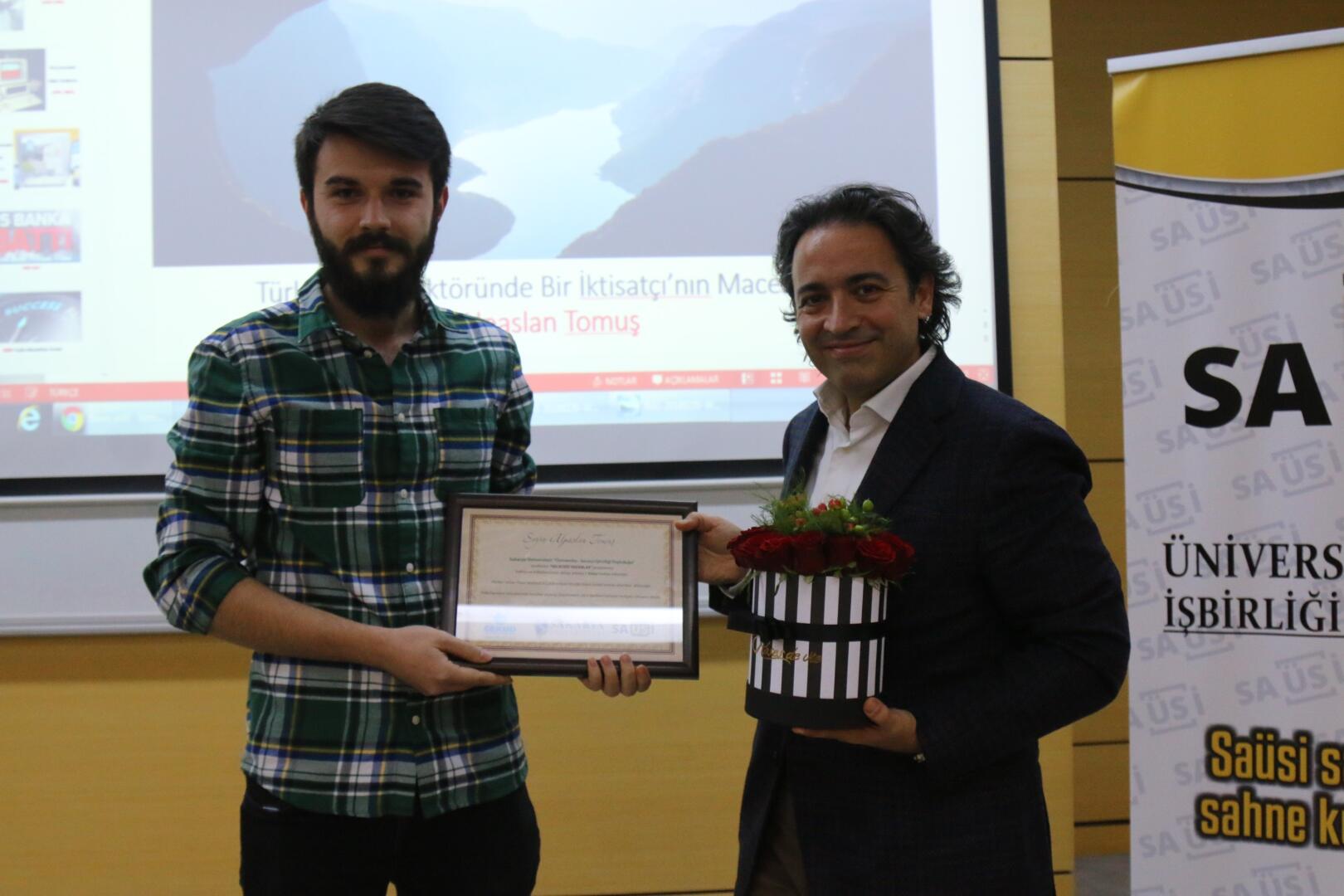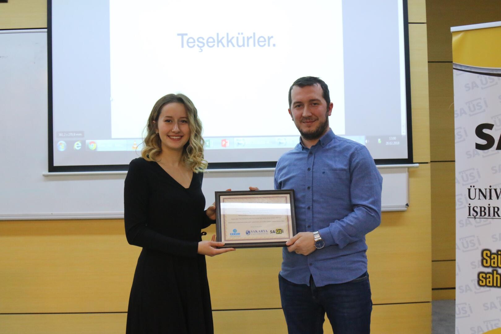 SAÜ’lü öğrencilere iş hayatı hakkında bilgiler veren Tomuş, öğrencilere yabancı dil konusunda kendilerini geliştirmeleri tavsiyesinde bulundu.