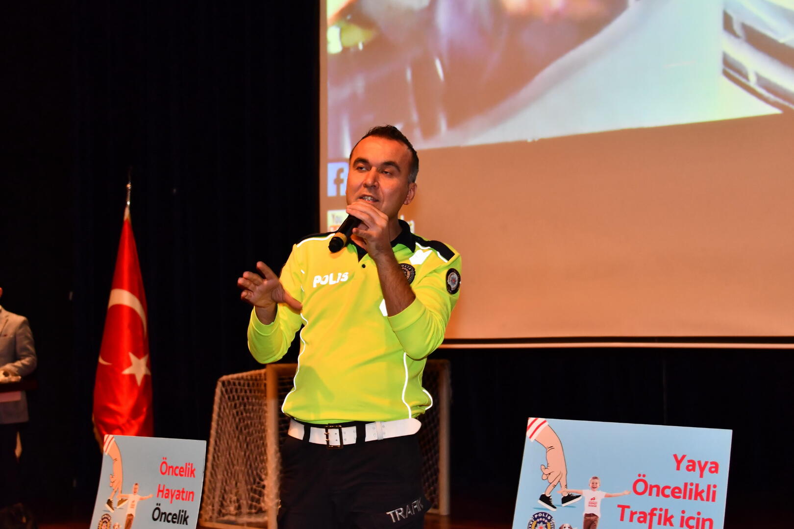 Murat Ünal konuşmasında güvenli sürüş kuralları başlığı altında cep telefonu kullanımı konusuna değinerek, cep telefonunun sürüş esnasında kullanılmasının birçok kazaya sebep olduğunu söyledi. Katılımcılara yolda yürürken ve arabada seyir halindeyken gerçekleşen kaza örneklerini gösteren Ünal, dikkat edilmesi gerekenler konusunda önerilerde bulundu. Ünal, “Hedeflerinize ve hayallerinize vücut bütünlüğüyle ulaşmak istiyorsanız, bunların bir tanesi de trafik kullarına uyumdur” dedi. Ünal, emniyet kemerinin doğru kullanılması, motosiklet ve motorlu bisiklet süren kişilerin trafikte dikkat etmesi gerektiği kurallar, hız konusu ve dönen kavşakların kullanılmasında dikkat edilmesi gerekenler konularına değindi. Ünal “Trafikte güven trafik kurallarına uyumdan geçiyor. Öğrendiğiniz kuralları kullanırsanız tehlikelerden korunursunuz” şeklinde konuştu.