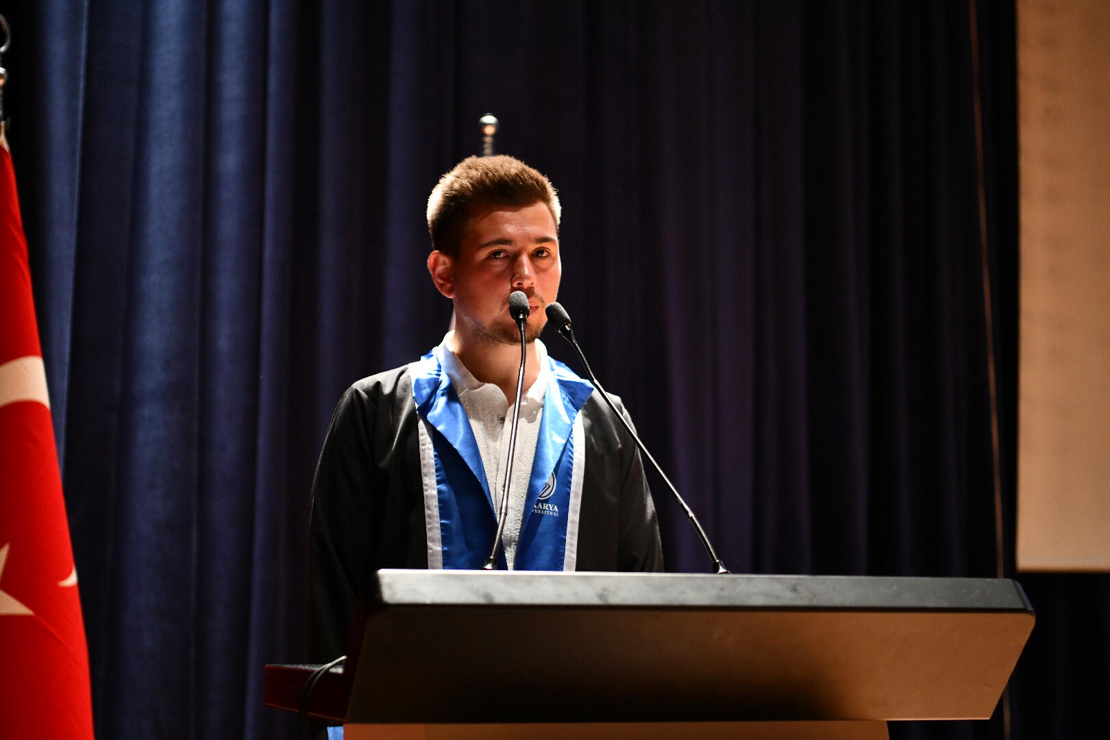 Saygı Duruşu ve İstiklal Marşı’nın okunmasının ardından, protokol konuşmaları gerçekleşti. İletişim Fakültesinin yarım asırdan daha uzun süredir eğitim öğretim faaliyetine binlerce yetişmiş insan kazandıran Sakarya Üniversitesinin genç bir dalı olduğunu söyleyerek konuşmasına başlayan Dekan Prof. Dr. Yusuf Adıgüzel, "Bugün 5. Mezuniyet Törenimizi gerçekleştiriyoruz. Bugüne kadar sizlerle beraber 700’e yakın arkadaşımızı iletişim sektörüne kazandırdık. Her biriyle gurur duyuyoruz. Her biri iletişim sektörünün çok önemli yerlerinde çok önemli görevler yapıyorlar. Sizler de çok iyi yerlerde olmaya devam edeceksiniz. Hepinizi şimdiden tebrik ediyorum, yolunuz açık olsun.” dedi.