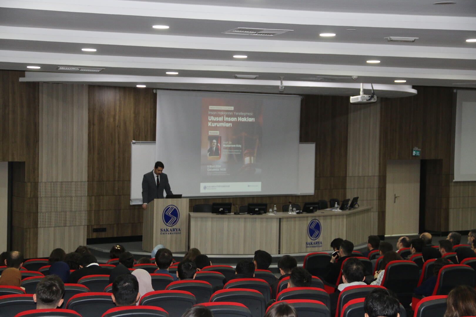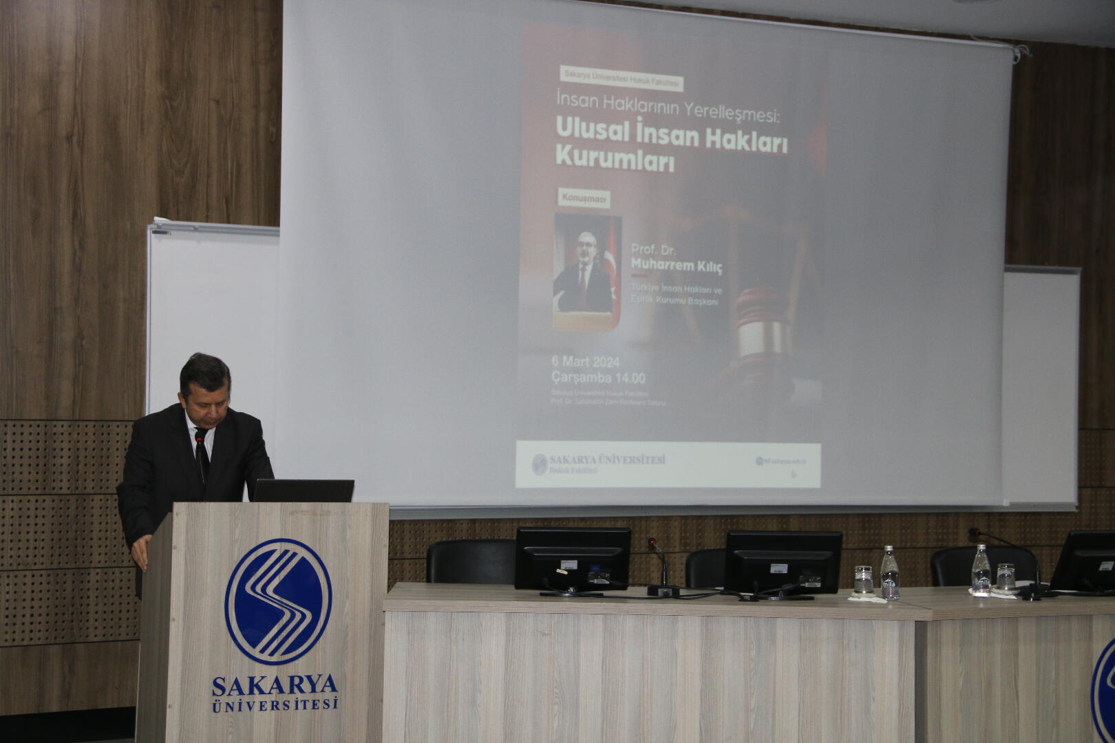 Sakarya Üniversitesi Hukuk Fakültesi tarafından düzenlenen Türkiye İnsan Hakları ve Eşitlik Kurumu (TİHEK) Başkanı Prof. Dr. Muharrem Kılıç’ın konuşmacı olarak katıldığı "İnsan Haklarının Yerelleşmesi: Ulusal İnsan Hakları Kurumları" konulu konferansa, Sakarya Üniversitesi Rektörü Prof. Dr. Hamza Al, Sakarya Üniversitesi Hukuk Fakültesi Dekanı Prof. Dr. Şafak Narbay, akademisyenler ve öğrenciler katılım sağladı.