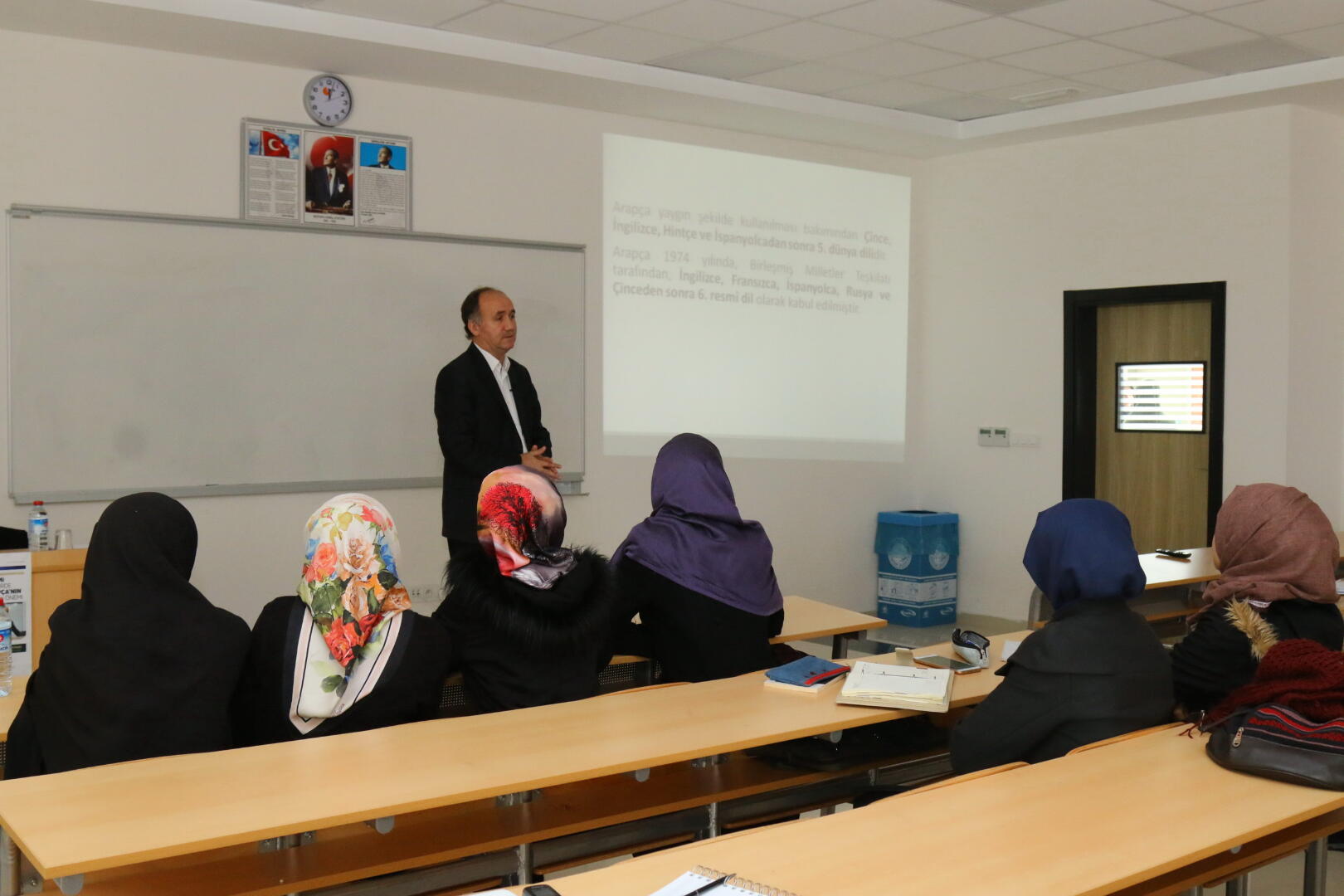 SAÜ İlahiyat Fakültesi Dekanı Prof. Dr. Ahmet Bostancı’nın konuşmacı olarak katıldığı konferans İlahiyat Fakültesinde yapıldı. Konferansta Arapçanın dünya dilleri arasındaki yerini anlatarak konuşmasına başlayan Prof. Dr. Ahmet Bostancı, Arapçanın yaygın şekilde kullanılması bakımından Çince, İngilizce, Hintçe ve İspanyolcadan sonra beşinci dünya dili olduğunu, 1974 yılında Birleşmiş Milletler Teşkilatı tarafından, İngilizce, Fransızca, İspanyolca, Rusya ve Çinceden sonra altıncı resmî dil olarak kabul edildiğini söyledi.