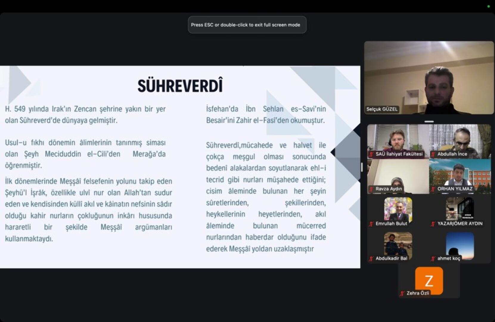 Dr. Güzel, sunumuna İşraki düşüncenin tarihsel kökenlerini anlatarak başladı. Ardından, bu düşünce ekolünün temel kavramları ve Yunan, Fars ve Hint gelenekleriyle ilişkisini ele aldı. Sunumun son bölümünde ise kötülük probleminin tarihsel ve güncel yansımalarını inceleyerek, Hristiyan teolojisi, kelam, tasavvuf ve İslam felsefesinin bu probleme dair yaklaşımlarını paylaştı. Ayrıca, modern dönemdeki izdüşümlerine değinerek İşraki düşüncede kötülük probleminin yerini açıkladı.