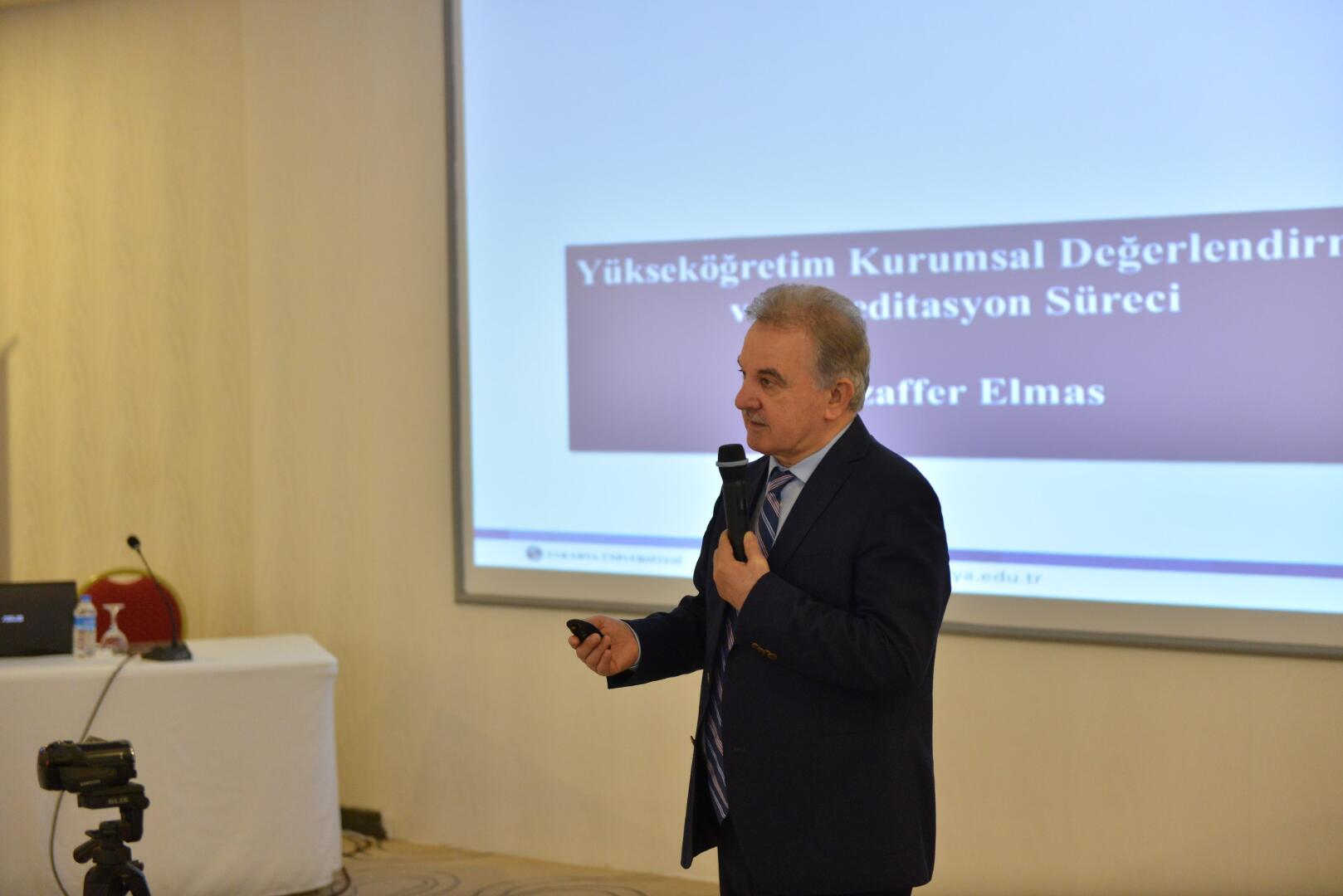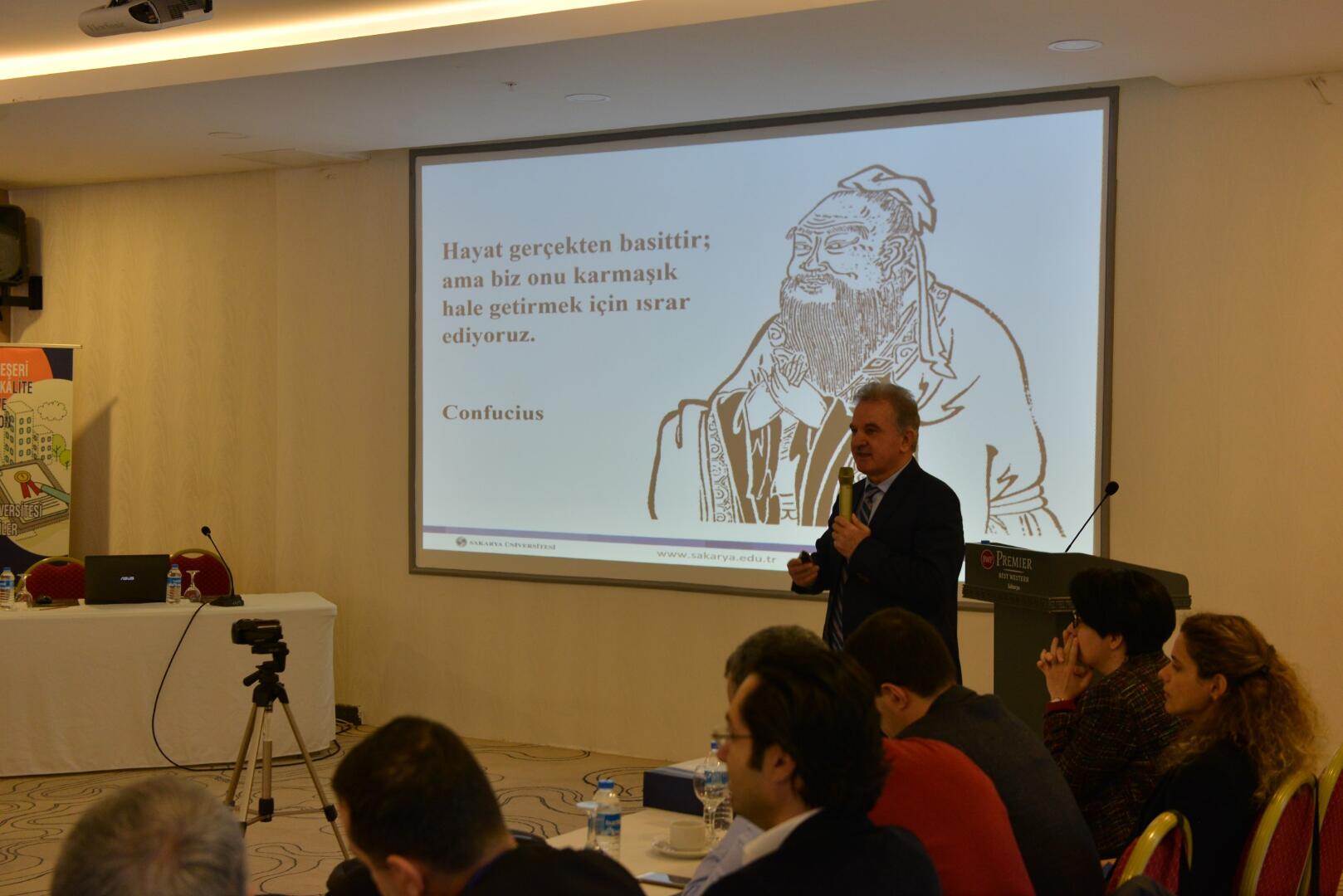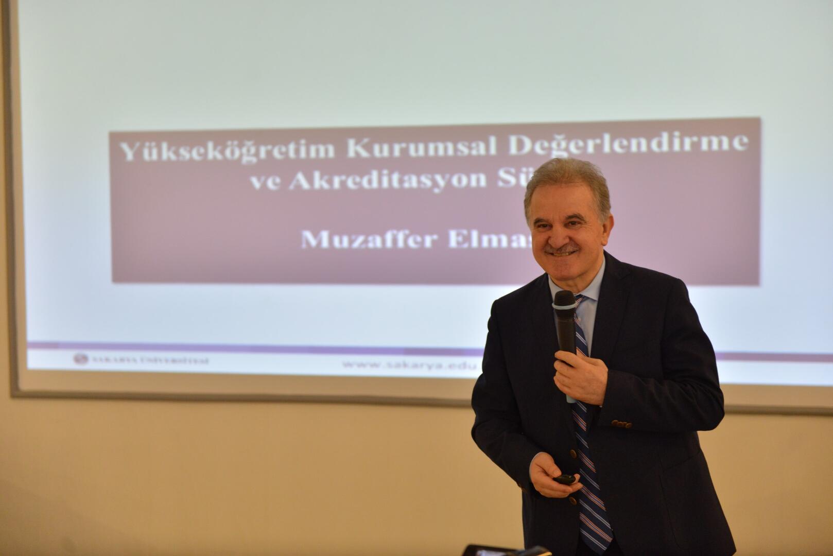 Yükseköğretim Kalite Kurulu Başkanı ve SAÜ Rektörü Prof. Dr. Muzaffer Elmas “Yükseköğretim Kurumsal Değerlendirme ve Akreditasyon Süreci” konusunda bir sunum yaptı. Dünyada akreditasyon alanındaki gelişmeler ve Türkiye’de yükseköğretimde akreditasyon süreçleri hakkında bilgiler veren Prof. Dr. Elmas, SAÜ’nün bütün akreditasyon değerlendirmelerine hazır olduğunu belirtti. Üniversitelerde dünyadaki değişime açık, bir çok alanda yetkin öğrenciler yetiştirmenin önemine değinen Prof. Dr. Elmas, “Programı dizayn ederken, öğrencileri geliştirmeye yönelik aktivitelerde bulunmalıyız. Derslere aktif katılımlarını sağlamalıyız. Öğrencilerimiz sınıf dışı ortamlarda da derslerine devam edebilmeli” diye konuştu.