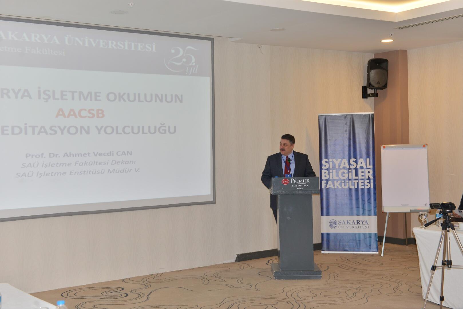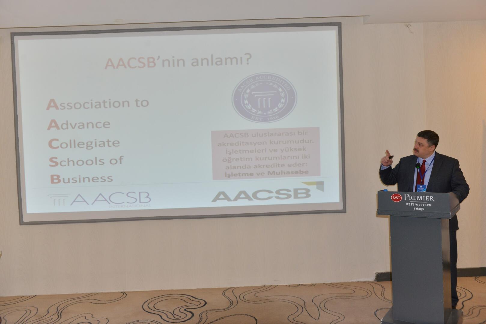 Sakarya Üniversitesi İşletme Fakültesi Dekanı Prof. Dr. Ahmet Vecdi Can, İşletme Fakültesi’nin başvurduğu AACSB akreditasyon süreci hakkında bilgiler verdi. AACSB akreditasyonunun, İşletme Fakülteleri için en üst düzeyde bir başarı standardı olduğunu söyleyen Dekan Prof. Dr. Can, “AACSB akreditasyonu dünyadaki en iyi işletme okullarının başvurduğu bir akreditasyon kuruluşu. Tüm birimlerin katılımını gerektiren zorlu bir süreçten geçmeniz gerekiyor” dedi. Prof. Dr. Can, konuşmasında, Türkiye’de ilk defa fakülte bünyesinde bir enstitü kurulduğunu bununda Sakarya Üniversitesi bünyesinde bulunduğunu söyledi.