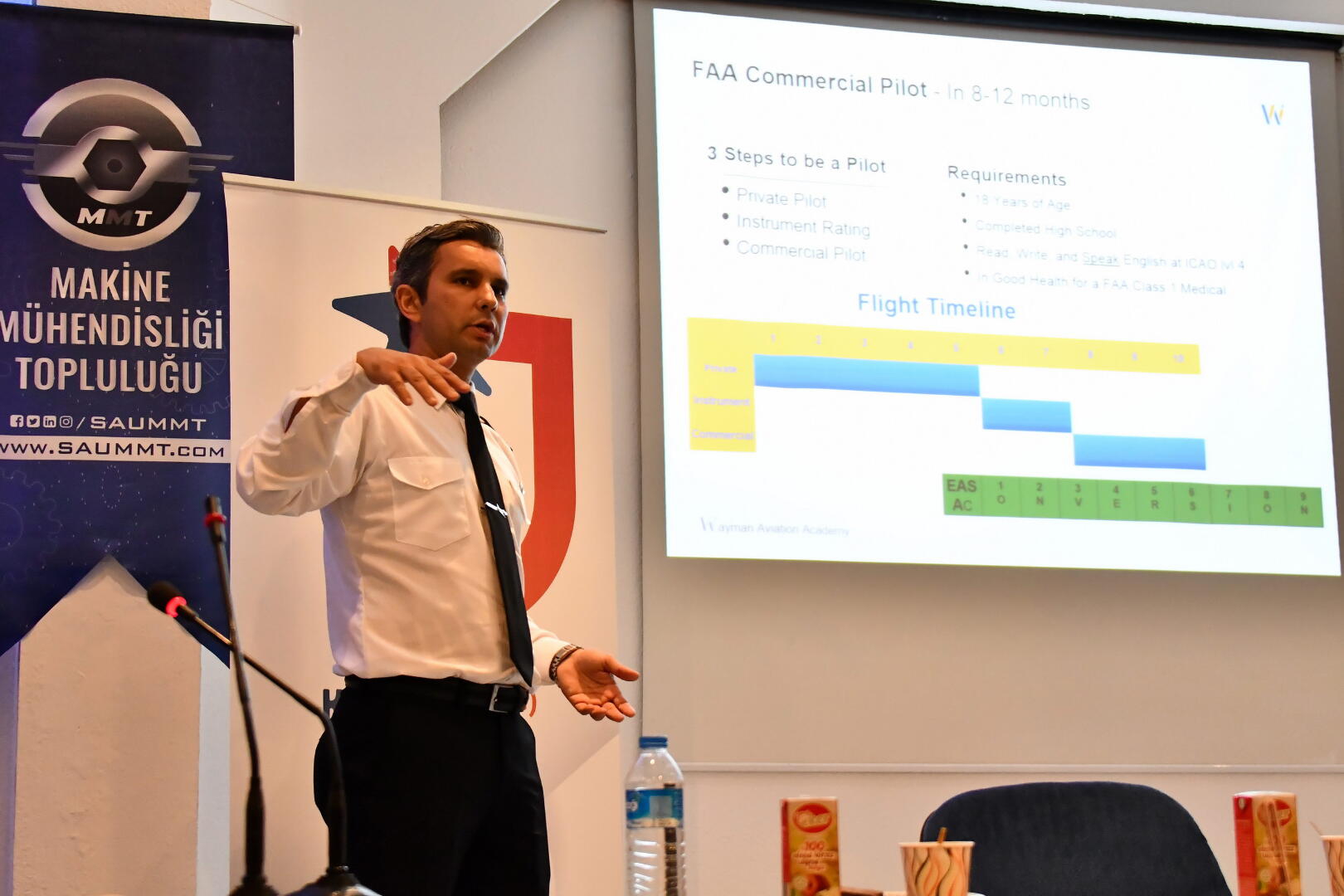 SAÜ Mühendislik Fakültesi Kongre Salonunda gerçekleşen seminere Yönetici-Pilot Erkan Özmeriç konuşmacı olarak katıldı. Özmeriç, seminerde havacılık ve pilotluk hakkında öğrencilere bilgi verdi.