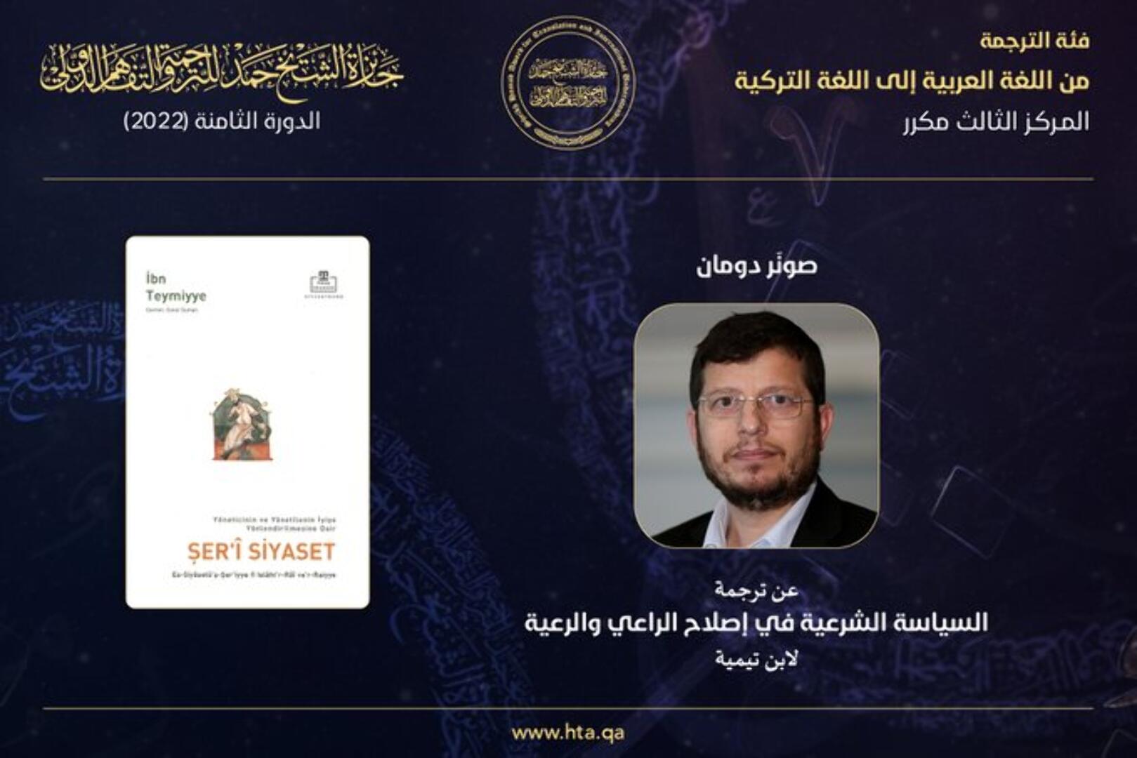 Prof. Dr. Soner Duman, Katar’da bu yıl sekizincisi düzenlenen Şeyh Hamad Çeviri ve Uluslararası Anlayış Ödülleri Kapsamında Arapçadan Türkçeye çeviri alanında üçüncülüğü elde etti. Prof. Dr. Duman Katar’ın başkenti Doha’da gerçekleşen törende, İbn Teymiyye’nin es-Siyasetü'ş-Şer'iyye kitabının tercümesi ile ödül aldı.