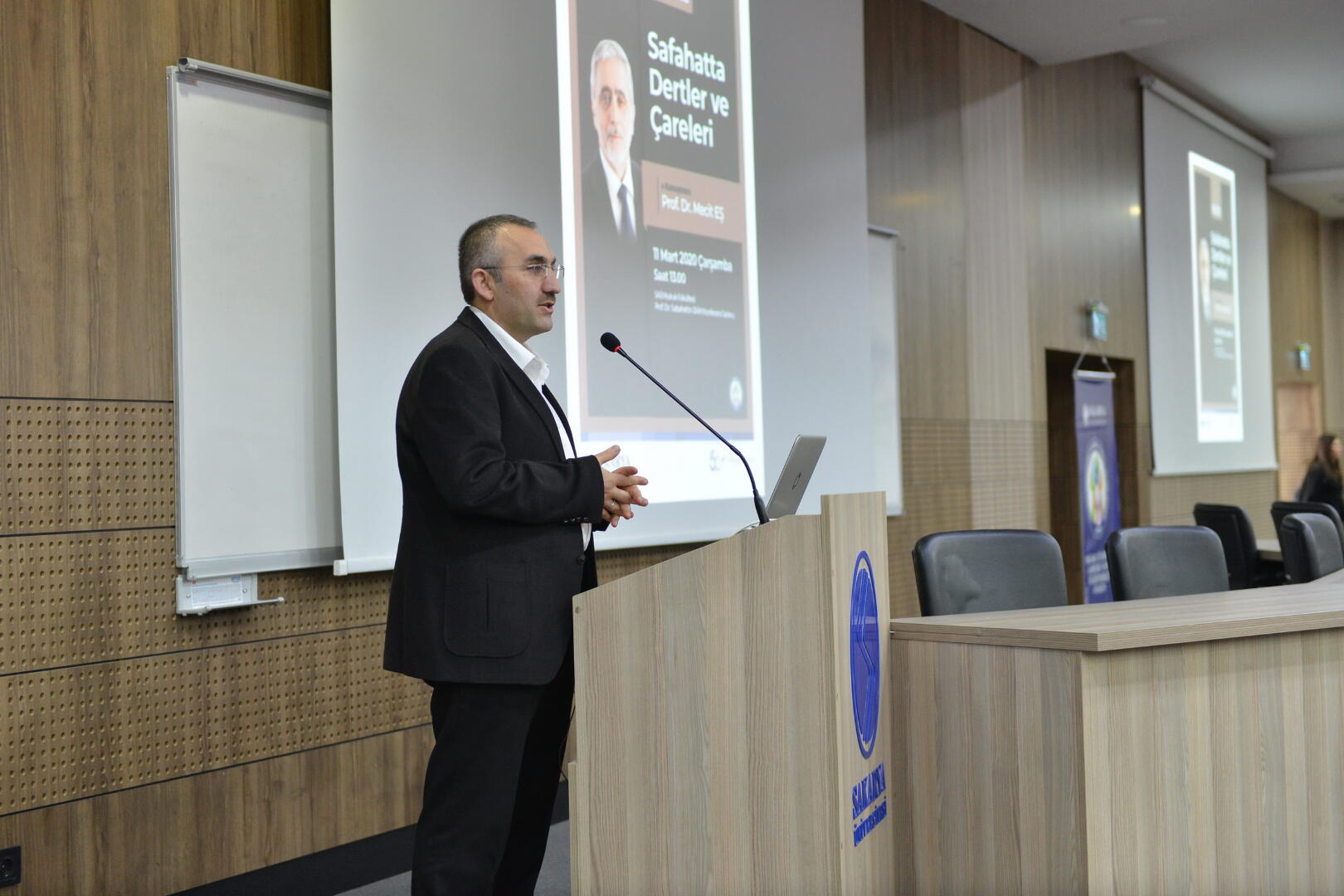 SAÜ Hukuk Fakültesi Sabahattin Zaim Konferans Salonunda gerçekleşen konferansa Prof. Dr. Mecit Eş konuşmacı olarak katıldı. Prof. Dr. Eş, İstiklal Marşı’nın 12 Mart'ta kabul edildiğini hatırlatarak, konuşmasında Mehmet Akif’i anacağını ve onun fikirlerinden bahsedeceğini söyledi.
