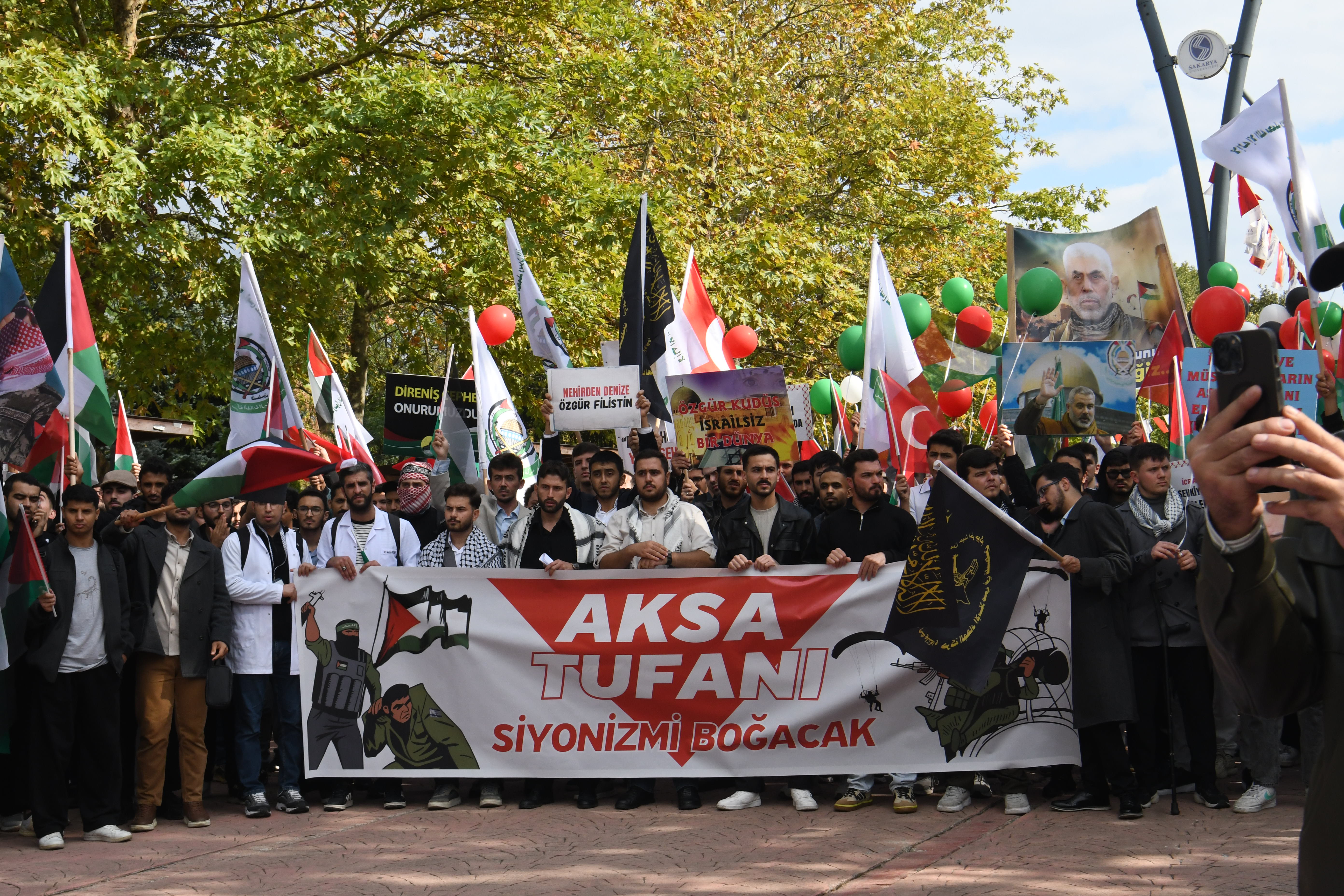 Sakarya Üniversitesi kampüsünde düzenlenen Filistin destek yürüyüşte, katılımcılar 7 Ekim olaylarının ikinci yıldönümünü anarak Gazze’deki soykırımı protesto etti.