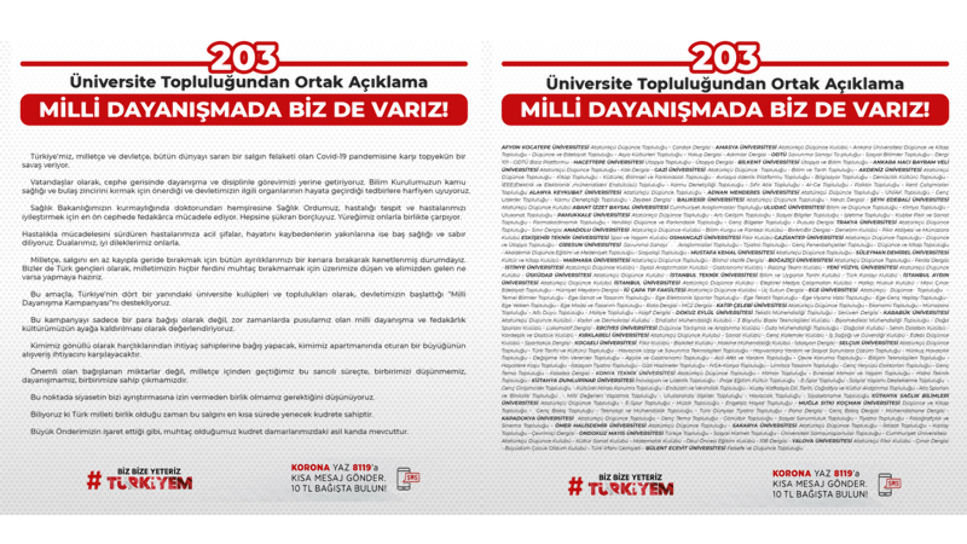 Aralarında, Sakarya Üniversitesi Atatürkçü Düşünce Topluluğu, Sakarya Üniversitesi İktisat Topluluğu, Sakarya Üniversitesi Kızılay Topluluğu ve Sakarya Üniversitesi Çevrimiçi Dergisi’nin de bulunduğu 203 öğrenci topluluğu ve kulübü “Milli Dayanışmada Biz de Varız!” başlığıyla ortak bir basın açıklaması yayımladı.