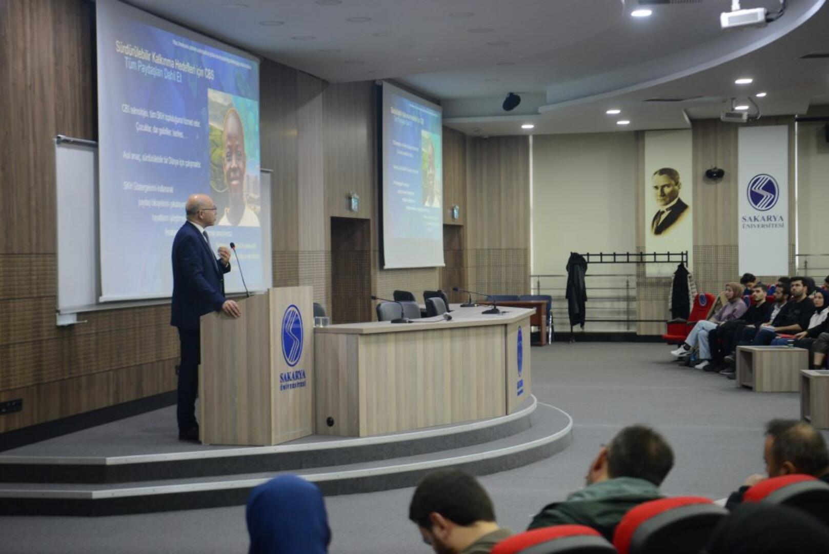 Sakarya Ekonomik ve Sosyal Araştırmalar Merkezi’nin de (SESAM) destek verdiği sayın Barış UZ, “Geleceğin İnşasında Coğrafi Bilgi Sistemlerinin (CBS) Sürdürülebilirlikteki Rolü” başlıklı konuşma gerçekleştirdi. SKA 11 Sürdürülebilir Şehirler ve Topluluklar kapsamındaki konuşmasında Barış UZ, CBS’nin gündelik hayat ve iş dünyası üzerindeki kullanım alanlarını deprem, yangın ve sel gibi afetler üzerinden açıkladı, Esri Türkiye’nin bu kapsamda sunduğu hizmetlerden bahsetti ve gelecekte yapılabilecek çalışmalarla ilgili örnekler verdi.