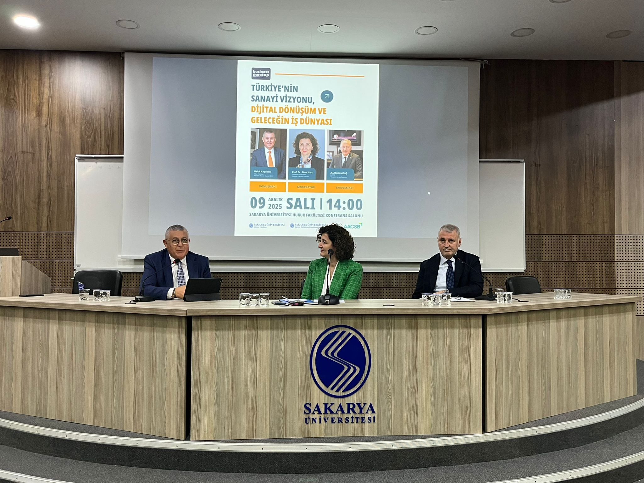 Sakarya Üniversitesi (SAÜ) İşletme Fakültesi ile Kariyer Geliştirme Koordinatörlüğü iş birliğiyle düzenlenen “Türkiye’nin Sanayi Vizyonu: Dijital Dönüşüm ve Geleceğin İş Dünyası” başlıklı etkinlik, SAÜ Hukuk Fakültesi Konferans Salonu’nda gerçekleştirildi. Öğrencilerin yoğun katılım gösterdiği etkinliğin moderatörlüğünü İşletme Fakültesi Dekanı Prof. Dr. Sima Nart üstlendi. Programda, Kibar Holding CEO’su ve Yönetim Kurulu Üyesi Haluk Kayabaşı ile Sakarya Ticaret ve Sanayi Odası (SATSO) Yönetim Kurulu Başkanı Akgün Altuğ konuşmacı olarak yer aldı.