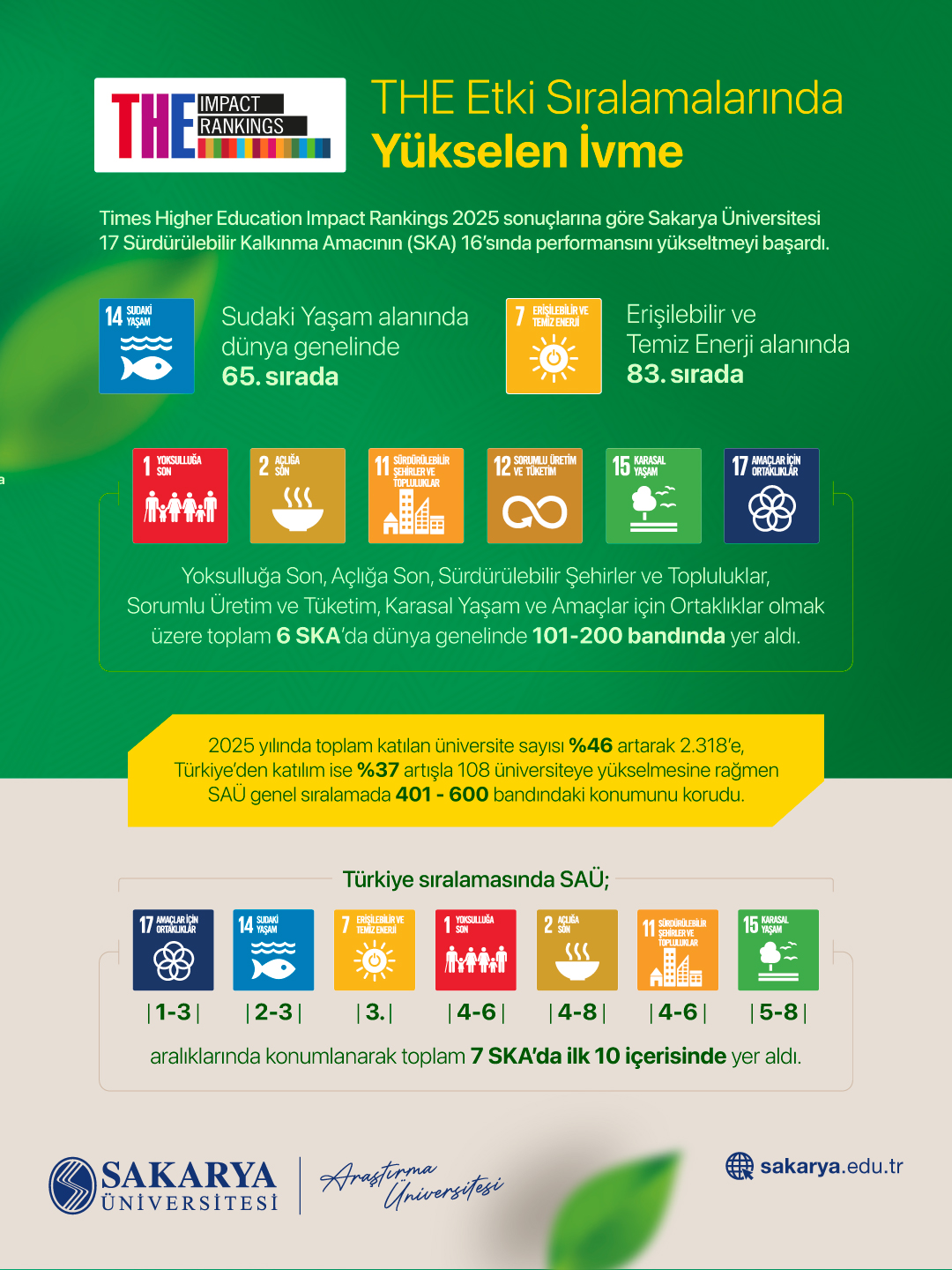 Times Higher Education (THE) Impact Rankings 2025 sonuçlarına göre Sakarya Üniversitesi, Birleşmiş Milletler Sürdürülebilir Kalkınma Amaçlarının (SKA) 17’sinden 16’sında performansını artırmayı başardı. SAU, “Sudaki Yaşam” alanında dünya genelinde 65’inci, “Erişilebilir ve Temiz Enerji” alanında ise 83’üncü sırada yer aldı.