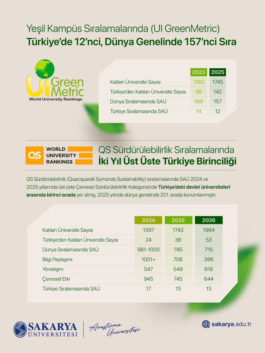 Bu sonuçlar, rekabetin her geçen yıl arttığı bir ortamda Sakarya Üniversitesinin sürdürülebilirlik performansını istikrarlı biçimde geliştirdiğini ortaya koydu.