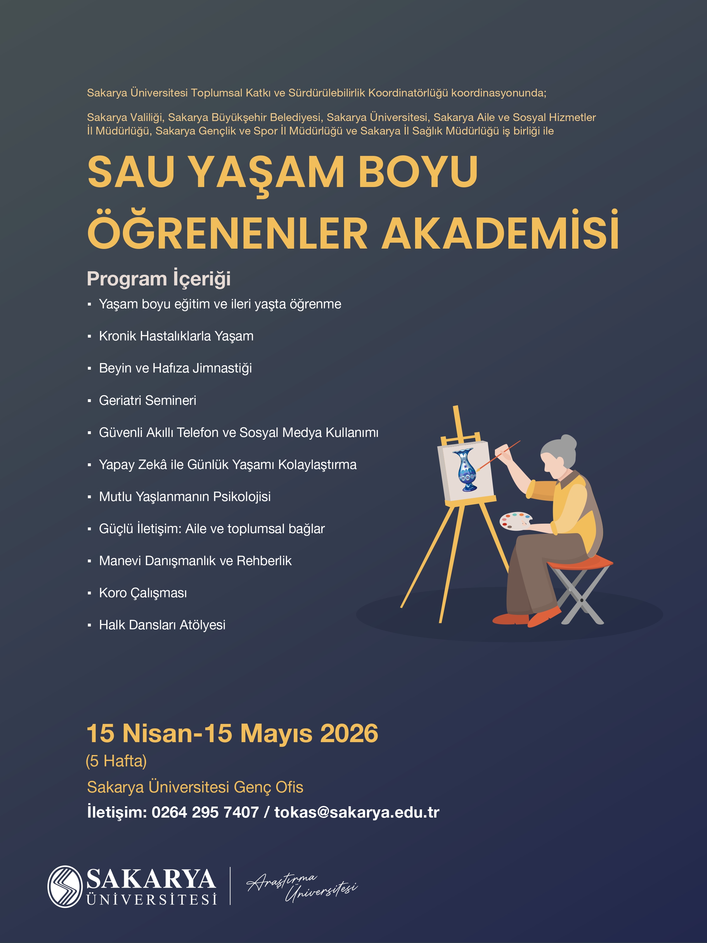 “Sakarya Üniversitesi Yaşam Boyu Öğrenenler Akademisi”, 60 yaş ve üzeri bireylerin yaşam kalitesini artırmayı, sosyal katılımlarını güçlendirmeyi ve yaşam boyu öğrenme süreçlerine aktif katılımlarını desteklemeyi amaçlıyor. Sakarya Üniversitesi Toplumsal Katkı ve Sürdürülebilirlik Koordinatörlüğü koordinasyonunda yürütülecek program Sakarya Üniversitesi, Sakarya Valiliği, Sakarya Büyükşehir Belediyesi, Sakarya Aile ve Sosyal Hizmetler İl Müdürlüğü, Sakarya Gençlik ve Spor İl Müdürlüğü ile Sakarya İl Sağlık Müdürlüğü iş birliğiyle gerçekleştirilecek.