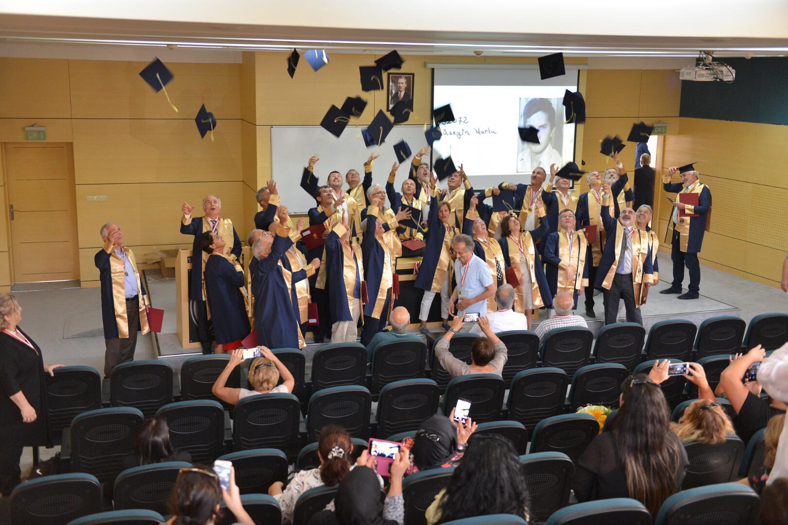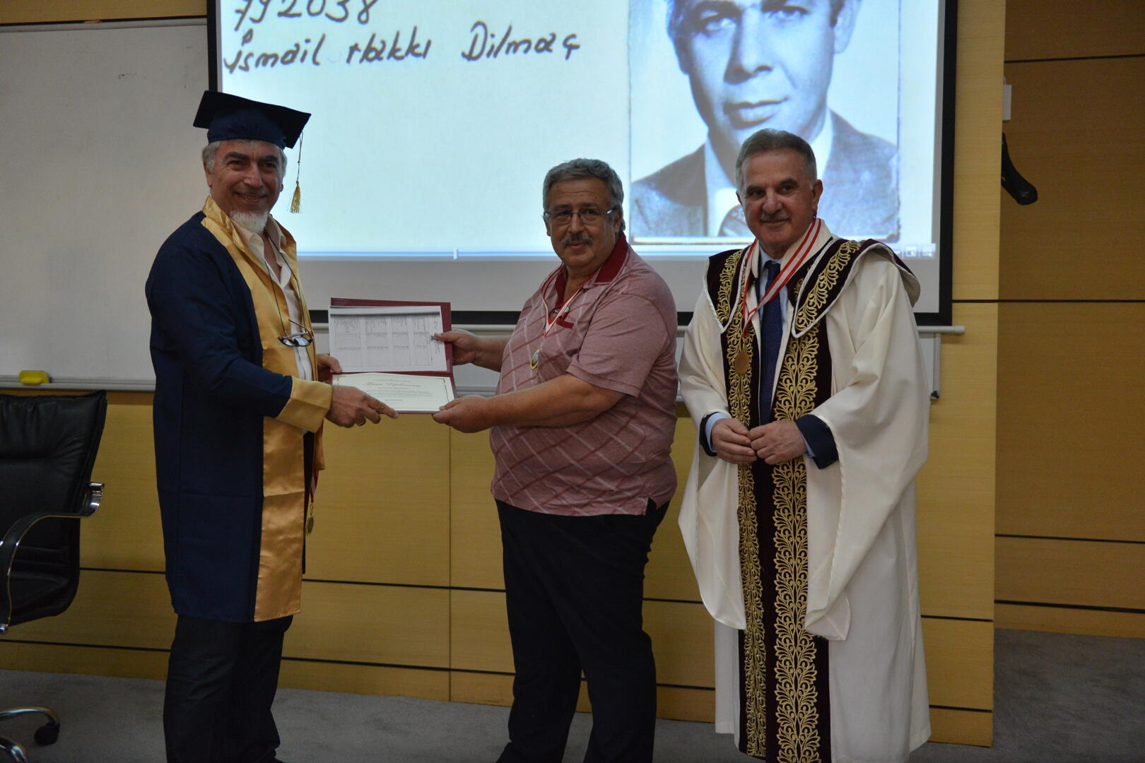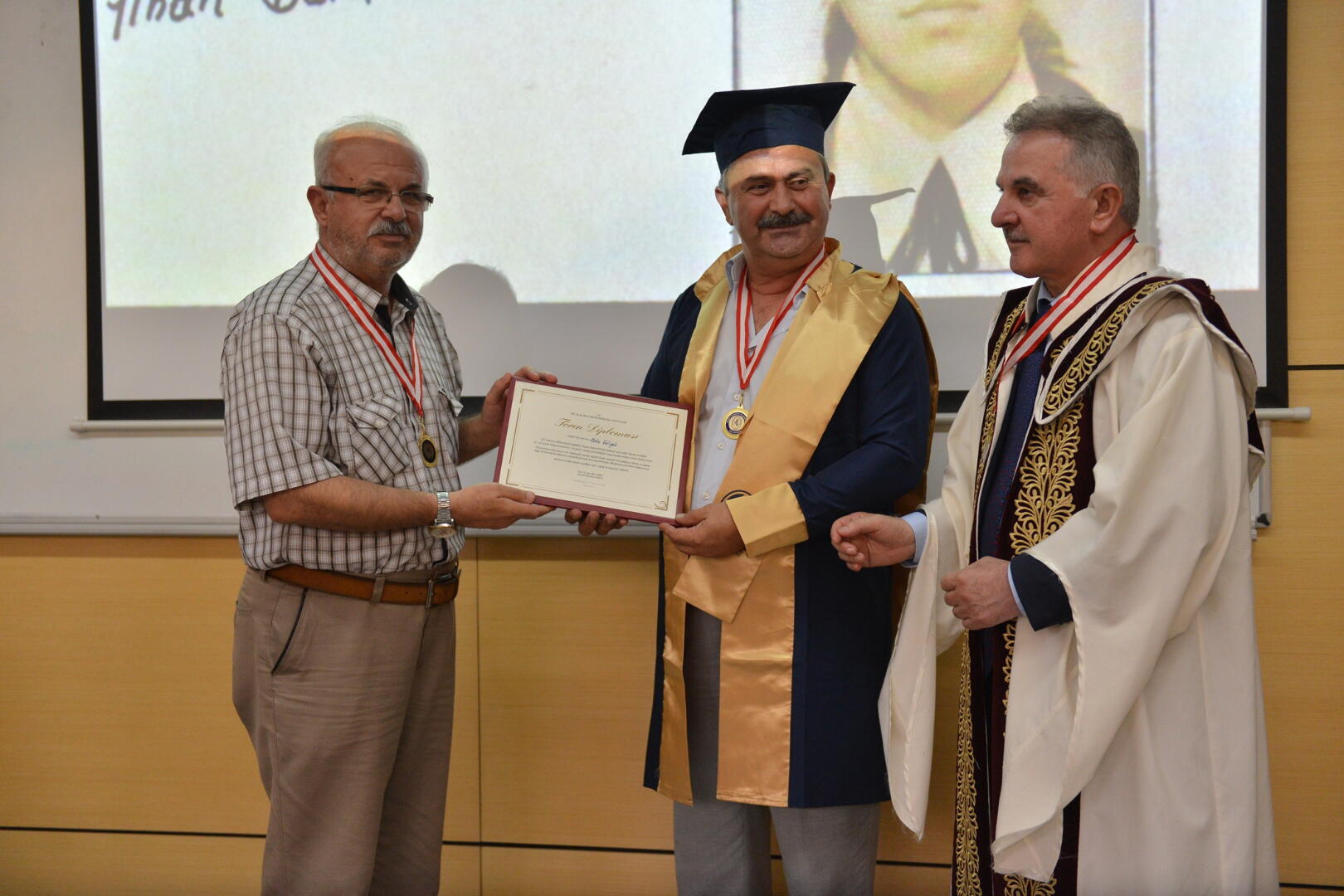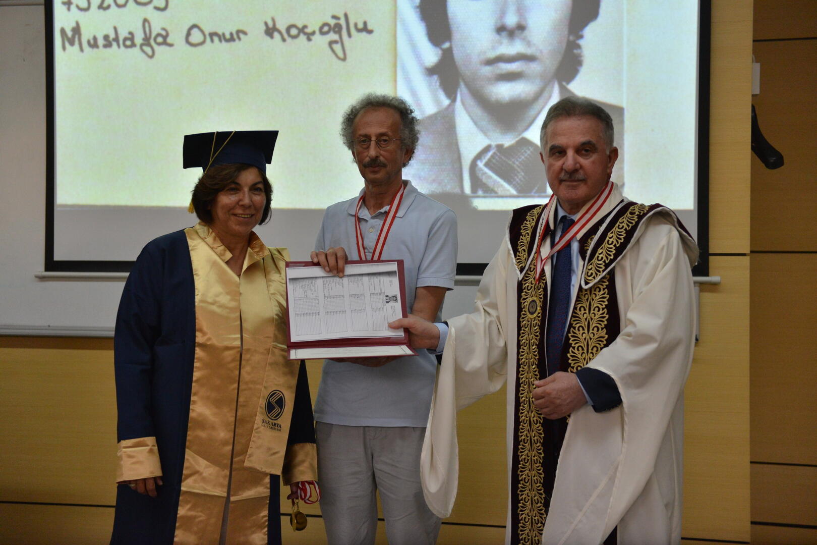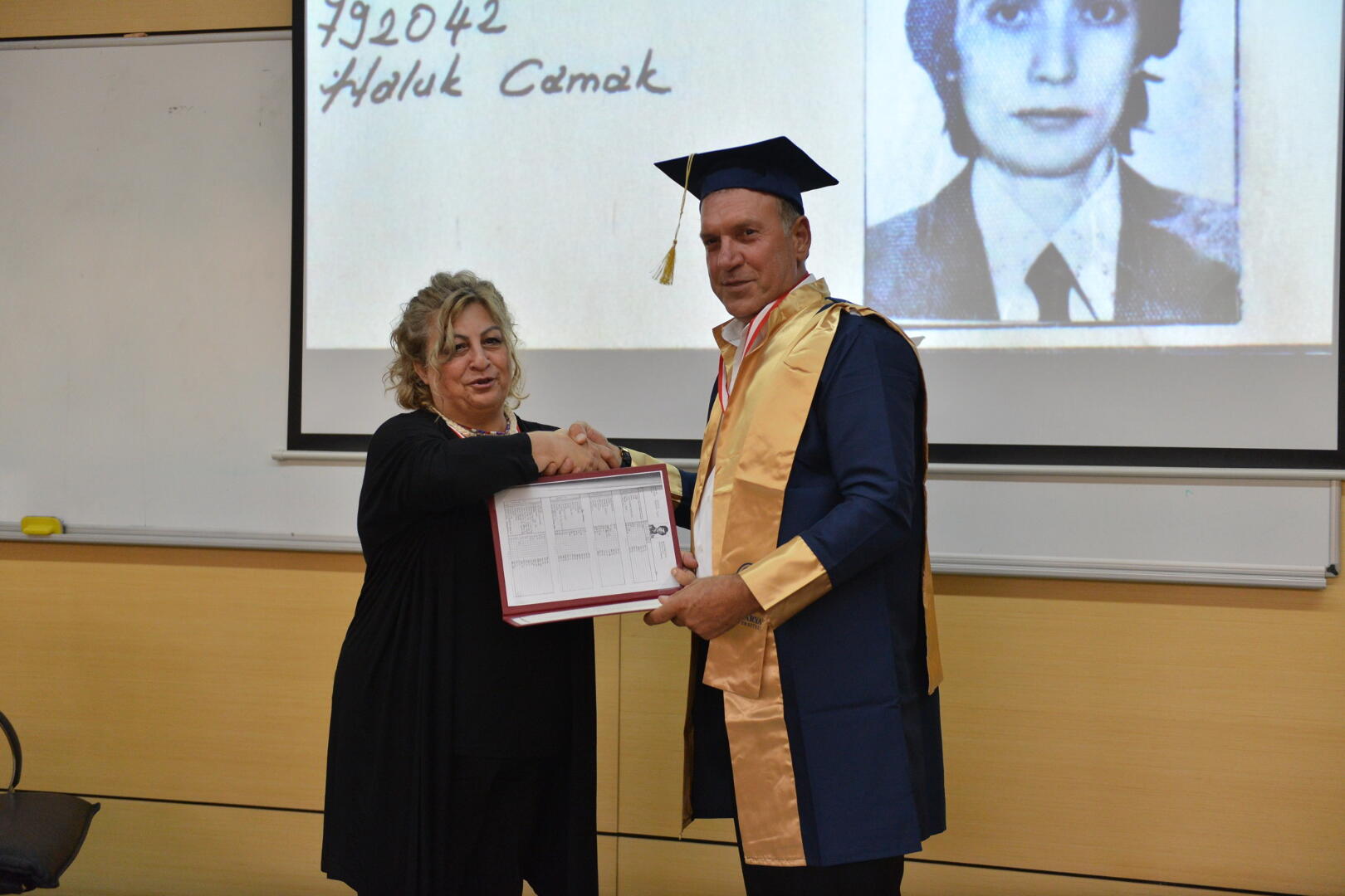 Törende mezunların kayıt defterleri de slayt eşliğinde gösterildi. Mezunlar belgelerini Rektör Prof. Dr. Muzaffer Elmas’ın elinden alırken, tören mezunların keplerini havaya atmaları ile sona erdi.