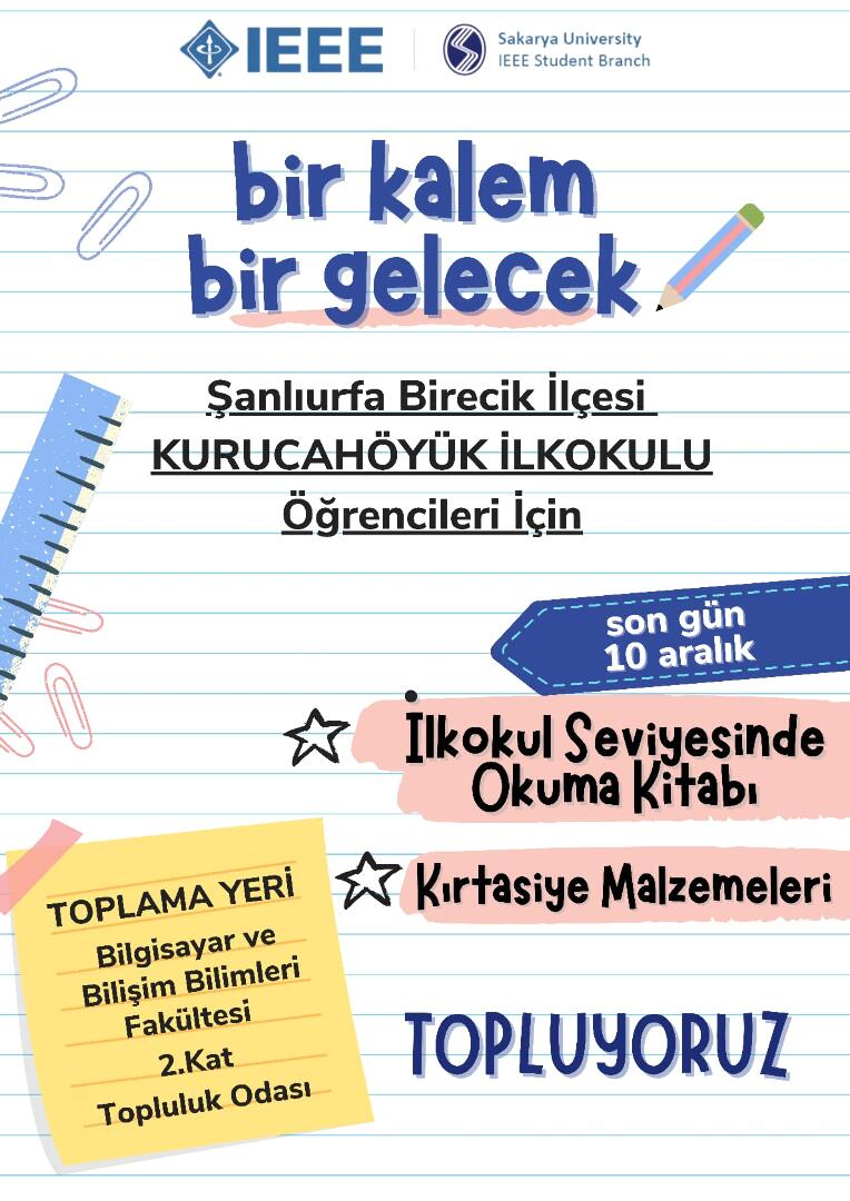 Sakarya Üniversitesi (SAÜ) Elektrik Elektronik Mühendisleri Enstitüsü (IEEE) Öğrenci Topluluğu, "Bir Kalem Bir Gelecek" projesi kapsamında bir köy okuluna yardım kampanyası başlattı.