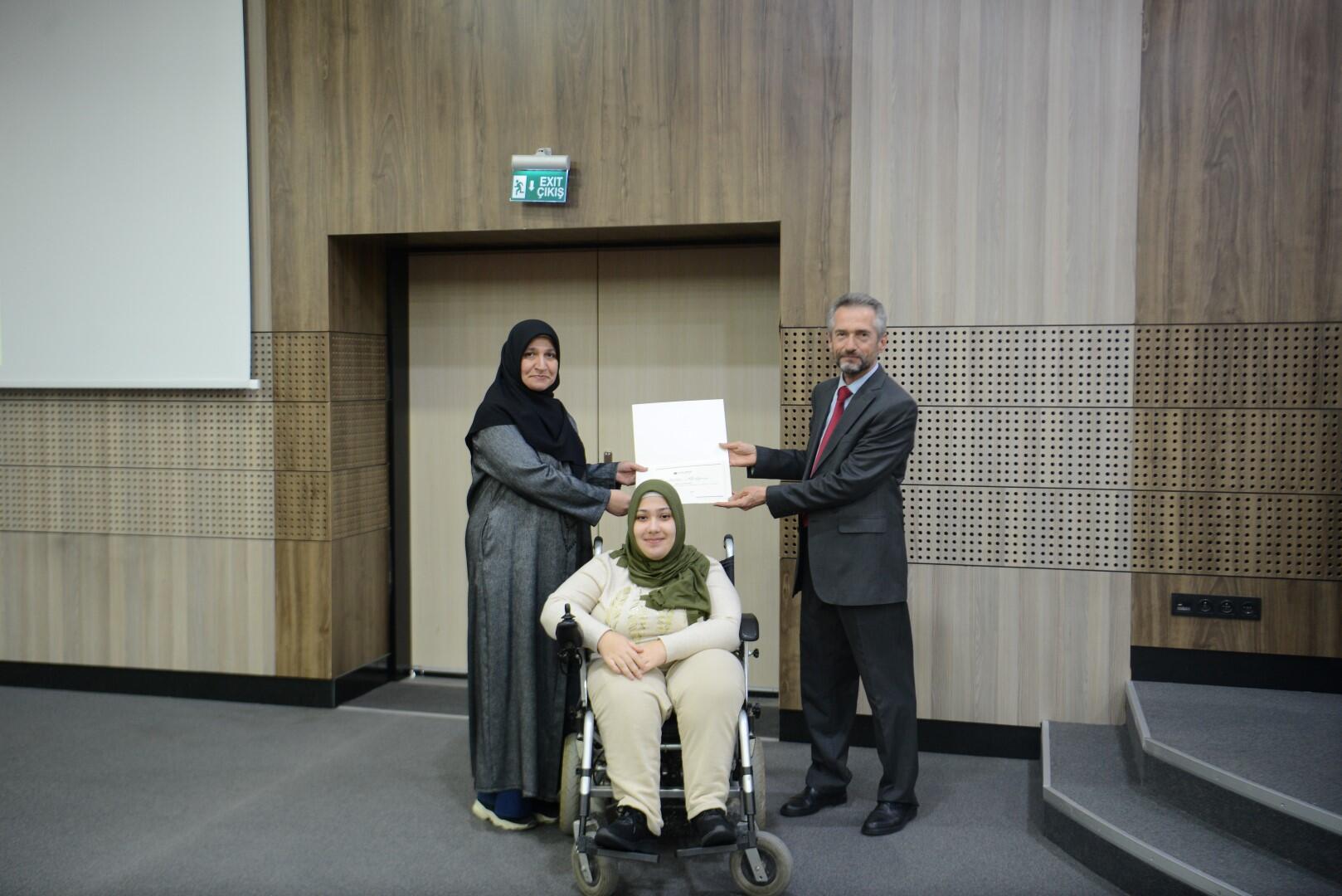 Davette ilk belge, Prof. Dr.Mustafa Çalışır tarafından özel öğrenci ve velisine verildi. Çalışır, ödül takdimi sırasında, “Bu belgeyi ben özel bir anneye vermek istiyorum. Hepimizin annesi kıymetli fakat annelerin fedakarlığı gözleri kamaştırır. Böyle bir anne, çocuğunu her sabah buraya kendisi aracıyla getiriyor, ders bitinceye kadar bekliyor ve ondan sonra evine götürüyor. Öncelikle biz teşekkürü kendisine sonra öğrencimize yapmak isteriz” dedi.