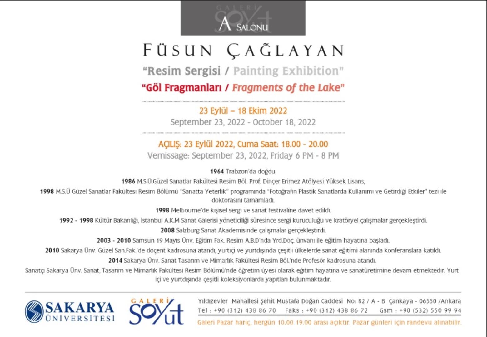 Sakarya Üniversitesi (SAÜ) Sanat Tasarım ve Mimarlık Fakültesi (STMF) Resim Bölümü öğretim üyesi Prof. Füsun Çağlayan’ın “Göl Fragmanları” adlı kişisel sergisi, 23 Eylül - 18 Ekim tarihleri arasında Ankara Geleri Soyut'ta sanatseverlerle buluşacak.