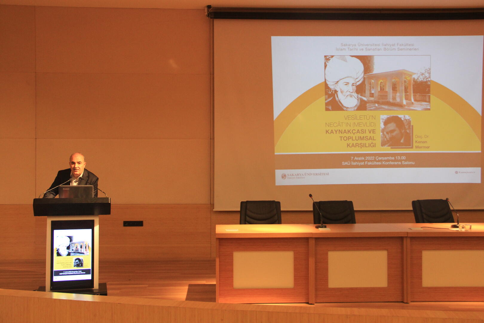 Sakarya Üniversitesi (SAÜ) İlahiyat Fakültesi İslam Tarihi ve Sanatları Bölüm seminerleri kapsamında Doç. Dr. Kenan Mermer tarafından verilen “Vesîletü’n-Necât’ın (Mevlid) Kaynakçası ve Toplumsal Karşılığı” konulu bir seminer gerçekleştirildi.